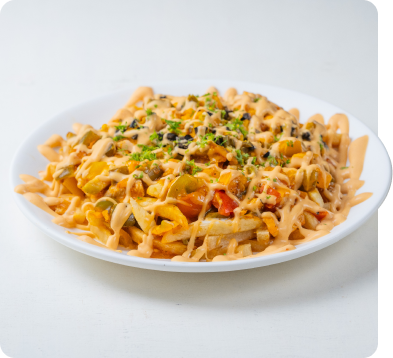 Our signature dish of 9mm fries topped with exotic veg, chicken, cheese and house dressing