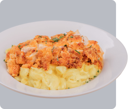 Chifferi Rigati Mac and Cheese topped with crispy fried chicken breast.